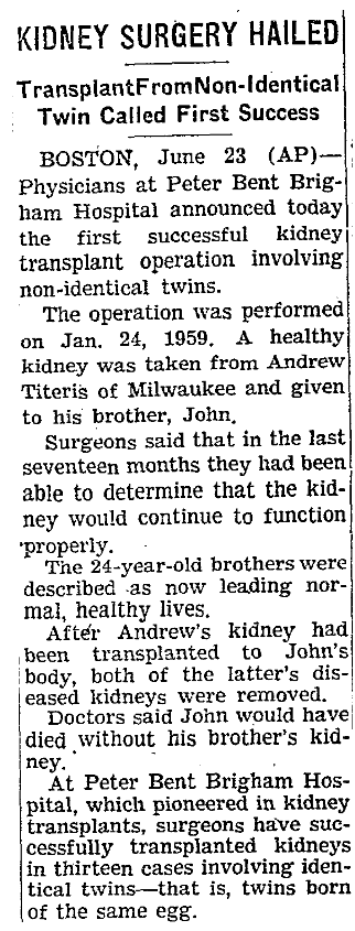 "Richard (left) and Ronald Herrick in 1955 after organ transplant surgery" (Associated Press)