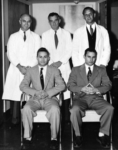 "Richard Herrick, front left, and his twin brother Ron, front right, pose with doctors, from top left, Joseph Murray, John Merrill and J. Hartwell Harrison, in 1954. Murray was lead surgeon in the first successful organ transplant in which Ron donated a kidney to Richard, who suffered from chronic nephritis, an inflamation of the kidneys."